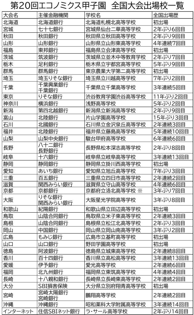 今大会の初出場は札幌北・会津など8校ある一方、昨年優勝した山梨大会代表の駿台甲府は6年連続出場。